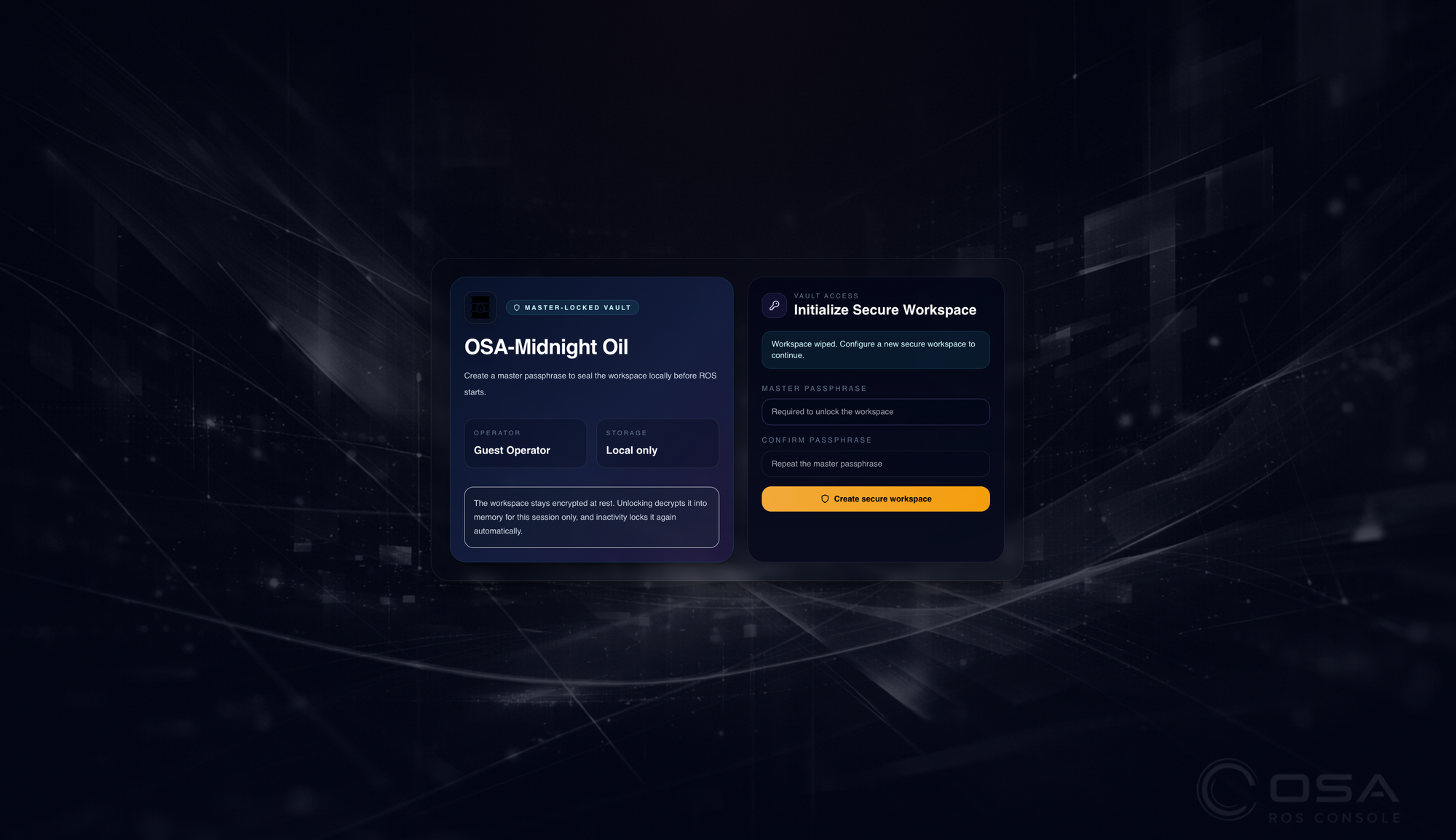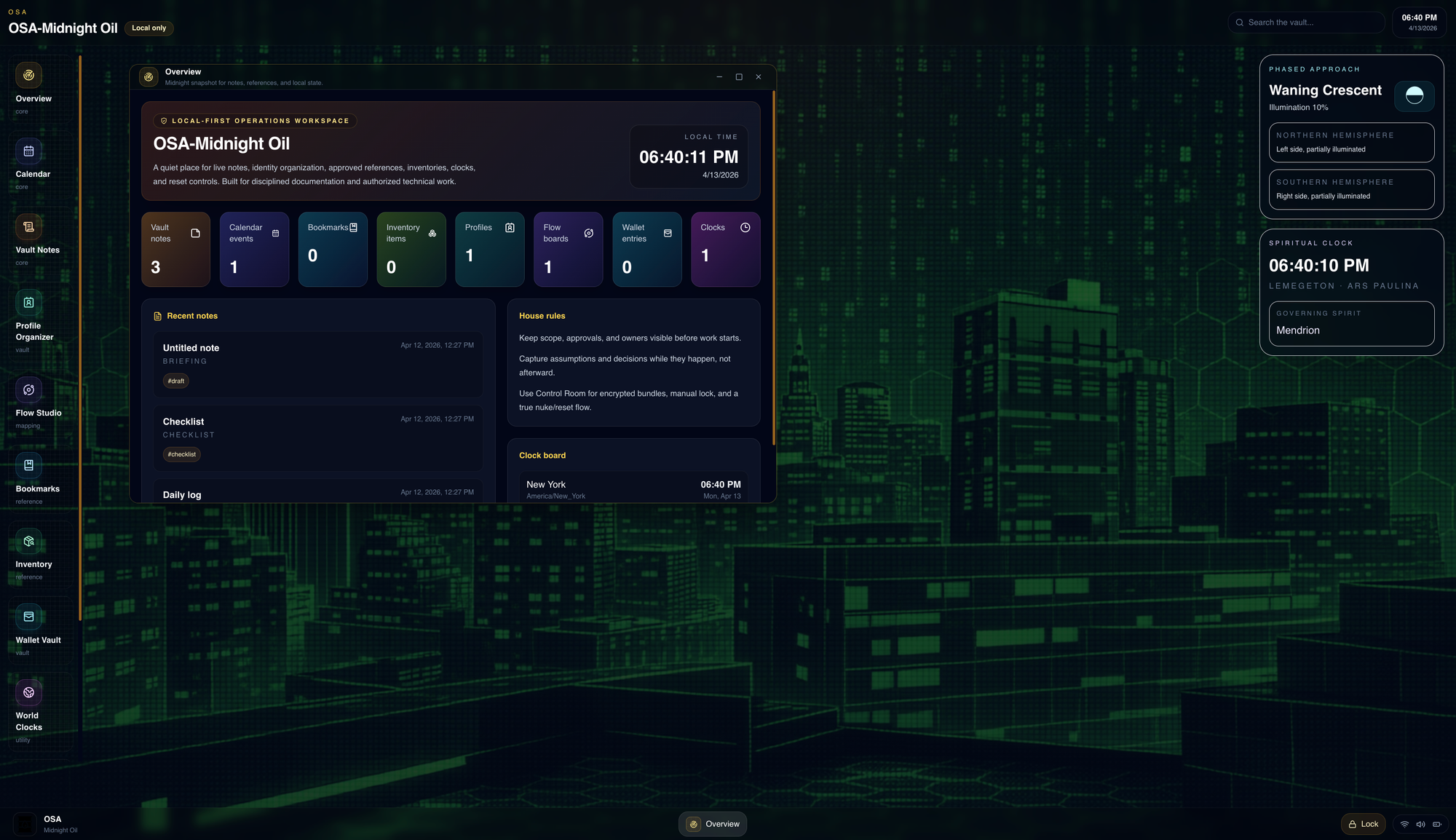 Overview: a high-level dashboard showing current workspace activity and counts.Calendar: a practical month-view planner for scheduling events, deadlines, and checkpoints.Vault Notes: markdown-first notes with live capture and quick planning structure.Profile Organizer: encrypted identity and account organization for names, emails, social logins, PGP notes, VPN zones, and related records.Flow Studio: wireframe diagramming for system flows, workflows, and network-style maps.Bookmarks: saved references, docs, links, and recurring tools.Inventory: software, operating system, methodology, and asset tracking.Wallet Vault: storage for wallet labels, addresses, and sensitive recovery material inside the master-locked workspace.World Clocks: multiple time zones in one place.Midnight Console: a local command console for quick read access into the workspace.Control Room: workspace controls for import/export, reset, wallpaper changes, and lock-state management.