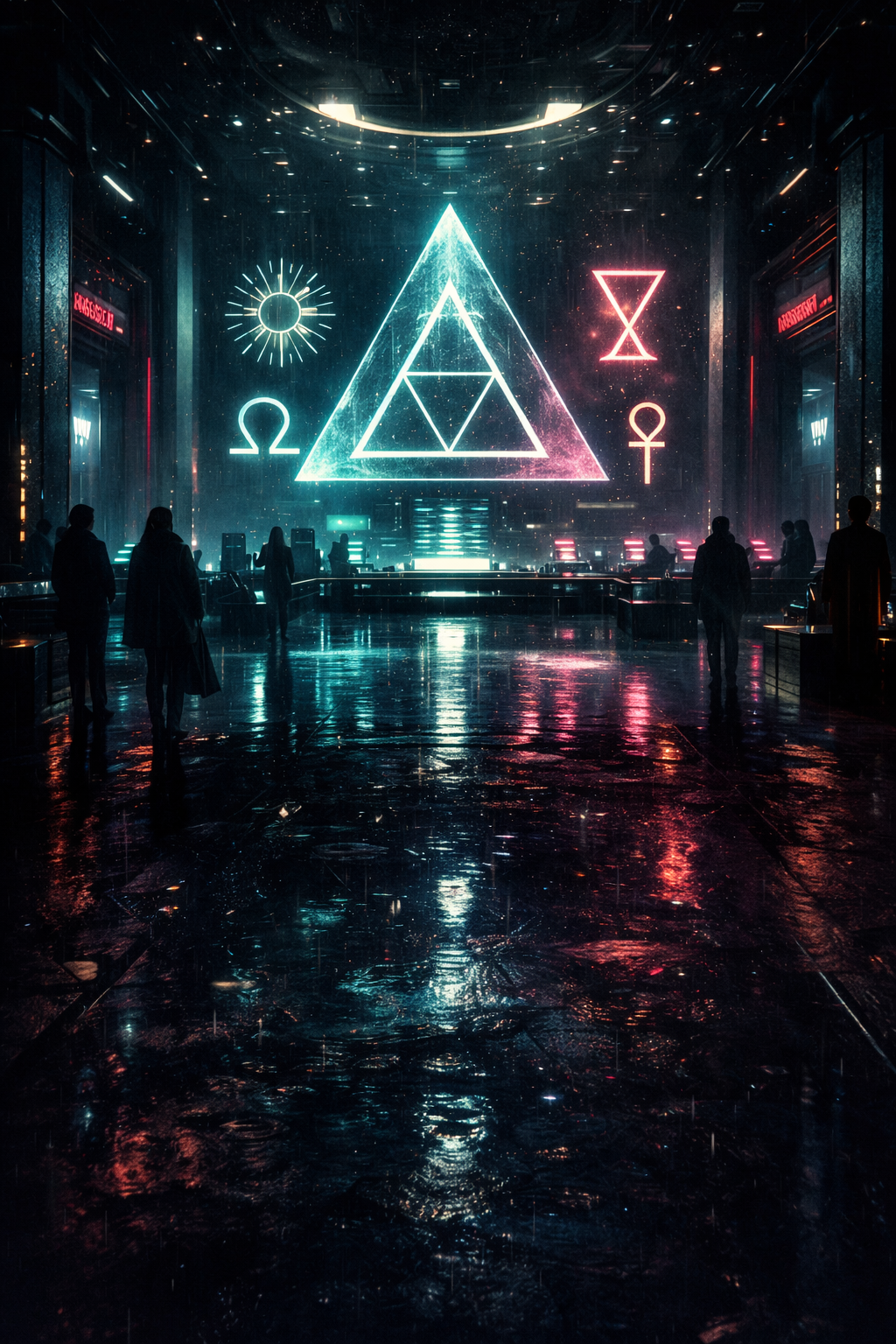 I sit alone in a dim citadel bar — the kind of place where neon bleeds into rain and the mirrors remember faces better than the patrons do. Outside the long window the city drifts past like a slow procession of ghosts. Footsteps. Umbrellas. Cigarette embers. Lives crossing the wet pavement like fleeting signals on a broken channel.