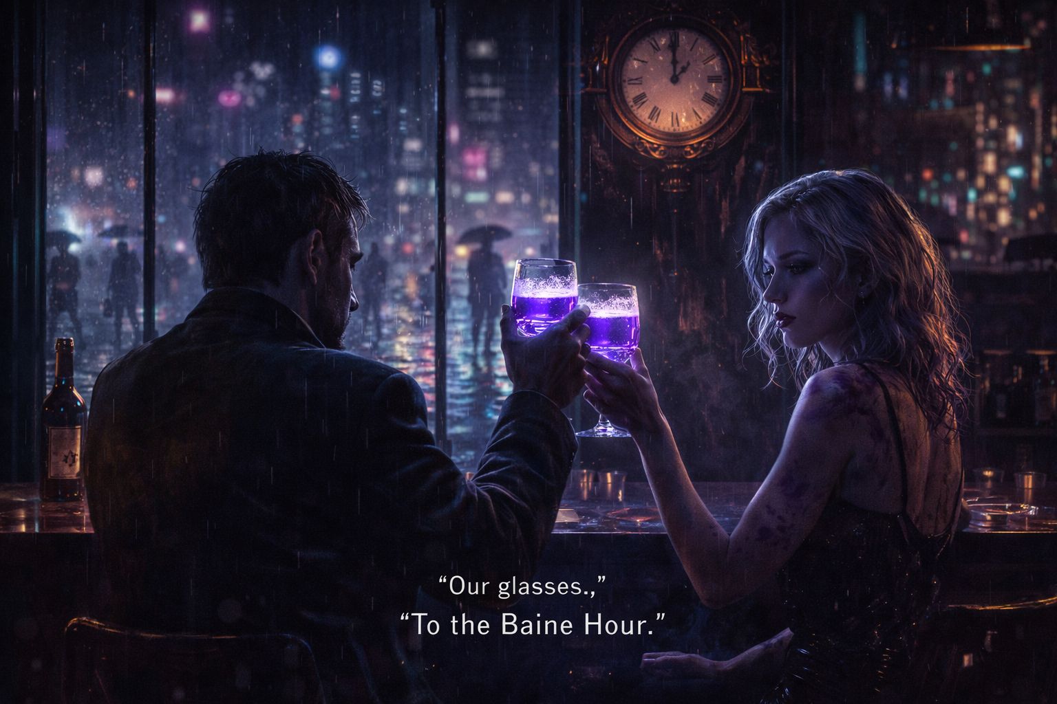 TheBaine Hour glides, as I sit gazing outside, through the night street window of this dimly lit city bar tonight. I watch ghosts and shadows of the passers-by, to bide my gratified pavine of Time. As I sit about this dimly lit city bar about the night. Daylights faded, the noise grew somber, as the White Horse hour neared by. As she walked in, thin and fair skinned, her body etched with glorious purples of her time. Sitting about the bar, her drink poured violet, frothy, white, while morphing with our space and time. The Grand hour rises, as I gather to my feet, to save this mistress of my kind. We laugh and watch, the ticking clock glide, the sound subdued as a sweeping hand would slide, with each turn it did click, but not for our kind; on this, our night - We raise and drink, to an oh so wonderful TheBaine time. Gilded from age time, now upon our 30s, we step set in the city streets to bide the cadence of the flow of our footsteps upon the pavement. Step by step, with her in arm, our black and purple love flows, a stream love can not disarm. Gazing ahead, one car, then two, the hour stands still in the wake of our Moonlit God. Her love behold my eyes with magnificent and vibrant pupils in disguise. I can't help but to stare; but I mustn't, I might...No...Yes! The Baine Hour glides and bends Will to our time. Her eyes scream, her love and pain pours through words of silence, of the course none is broken. I can't look away, to break her gaze, her eyes gape, is to but break mine. We must go forward, this Vicious and Vivacious love we command has stopped the sands of time. Do her eyes codone a kiss, as the thought ponders I'm striken of oxygen as steals my soul with her kiss. The streets spinning out of control, life doesn't exist, just us, commanding this hour of our watches, entwined, oxygen morphing together as the sands, now wet cease to drip out of time.